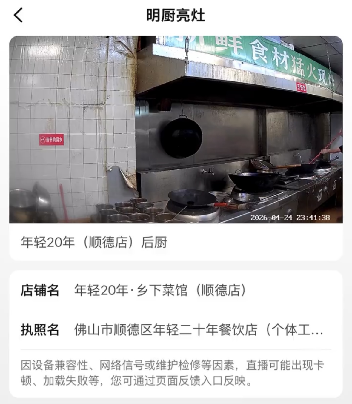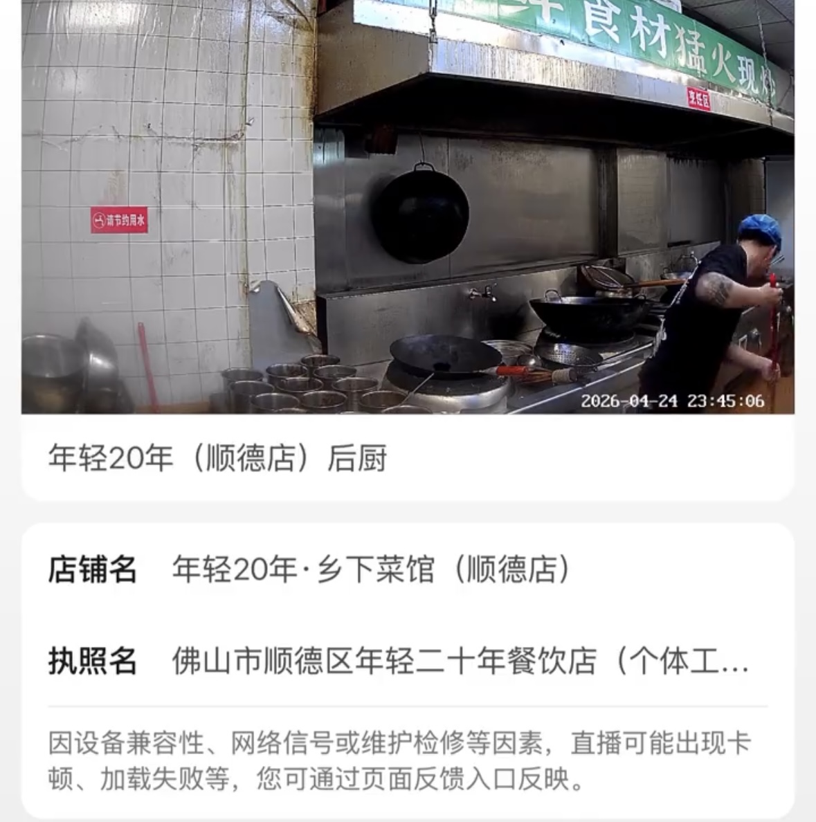 冯女士告诉封面新闻记者,24日晚,她想吃宵夜,于是,便打开外卖平台寻找。她点进一家评分4.7分的“年轻20年·乡下菜馆(顺德店)”,因商家正好有“明厨亮灶”,她便点击进去。这是后厨的直播,此时,已经23点40左右,后厨工作人员正在做清洁。